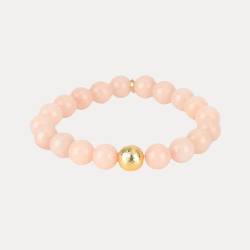 Our Bianca Blush beaded bracelet is a classic Mala bracelet popped with a fabulous brushed-gold bead. The Bianca is made of blush pink jasper stone and is the perfect beaded bracelet for women (or men) that can effortlessly be paired with AWB. An Elastic component makes the Bianca an easy on and off accessory. One size fits most.