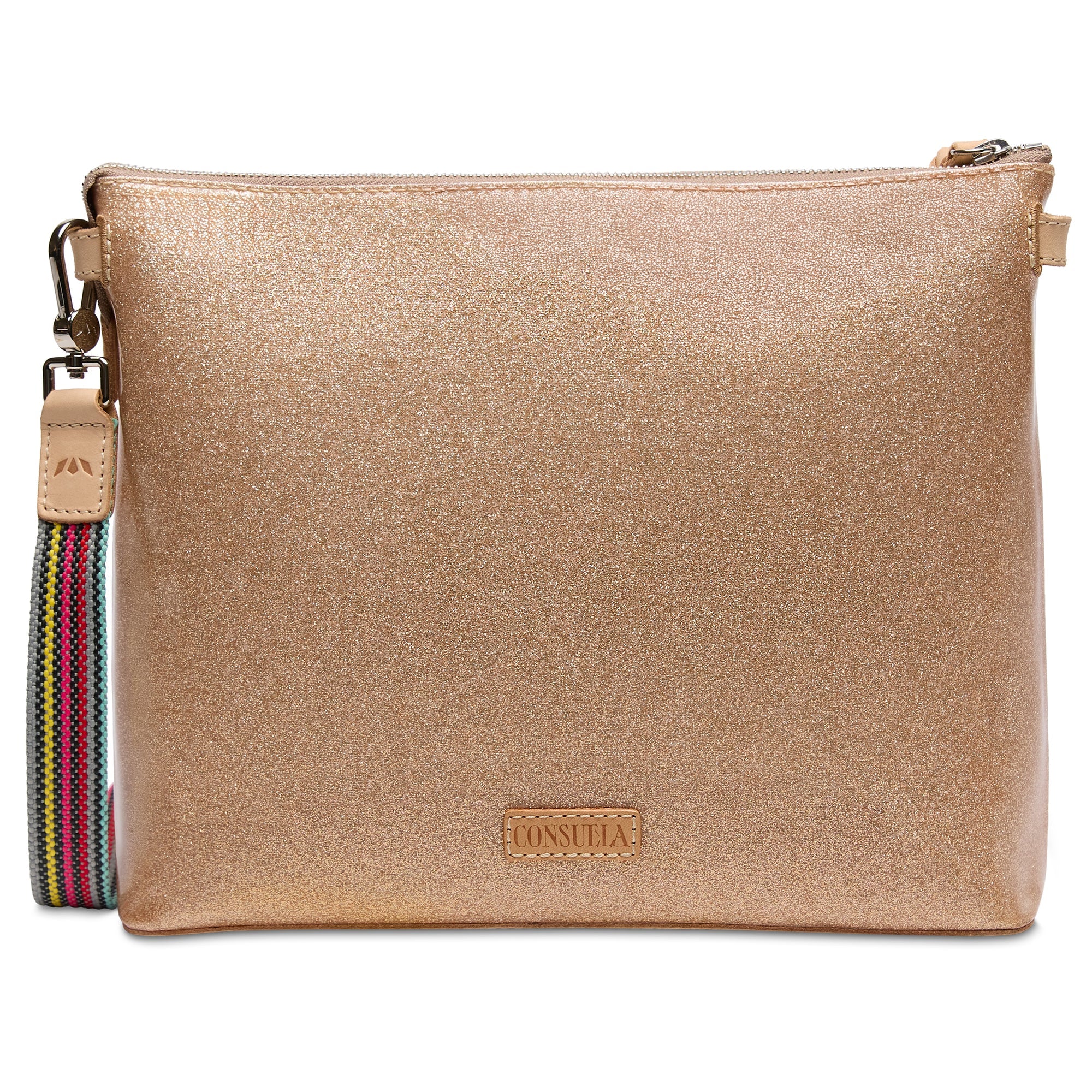 - Includes detachable and adjustable woven crossbody strap