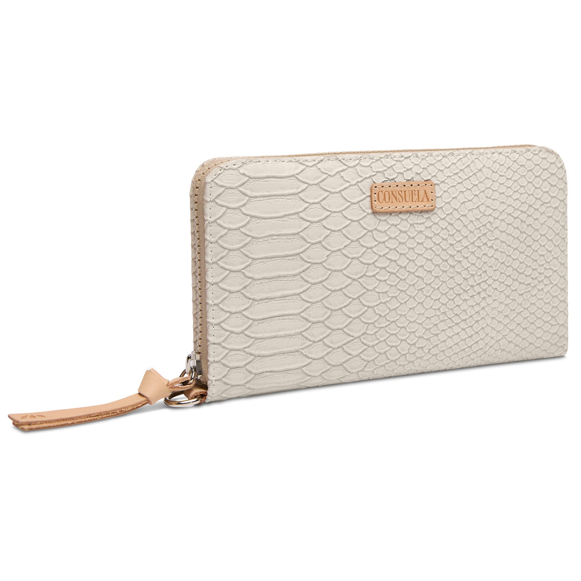 Function and versatility in the palm of your hand. Our Essential Wallet is a streamlined, large-capacity wallet with plenty of room for cards, cash, and receipts — plus a zippered center compartment for coins and keepsakes. We added a D-ring so you can easily clip it to any Consuela wristlet strap or anchor onto an inside lanyard for added security.