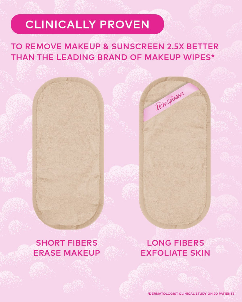 Erase all makeup with JUST WATER™ including waterproof. Our patented, water-activated, cloud-soft fibers gently & easily remove all makeup & sunscreen from pores. 2 in 1 benefit: one side erases makeup & one side exfoliates skin.