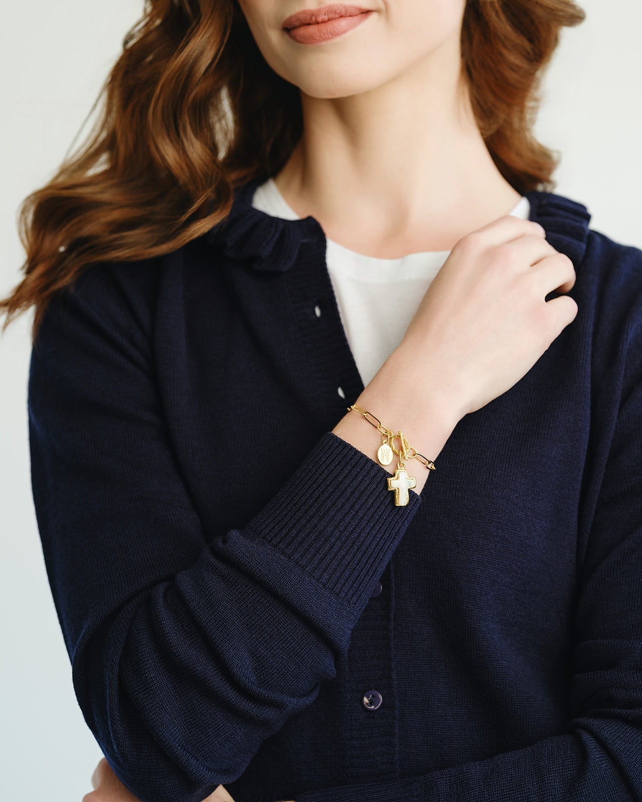 This bracelet features glistening Mother of Pearl hand-cut to a favorite Susan Shaw shape. With its timeless design, this piece celebrates faith with a refreshingly timeless fashion.